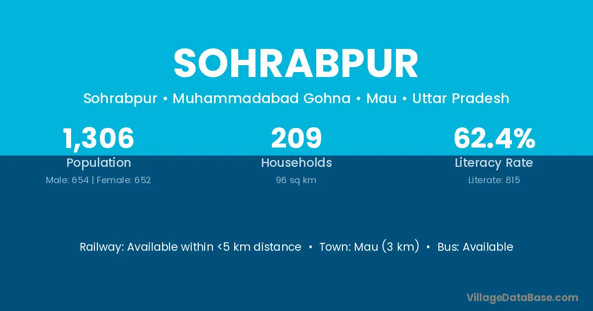 Mau (3 km) is the nearest town to Sohrabpur village for major economic activities and is located approximately 3 km away.