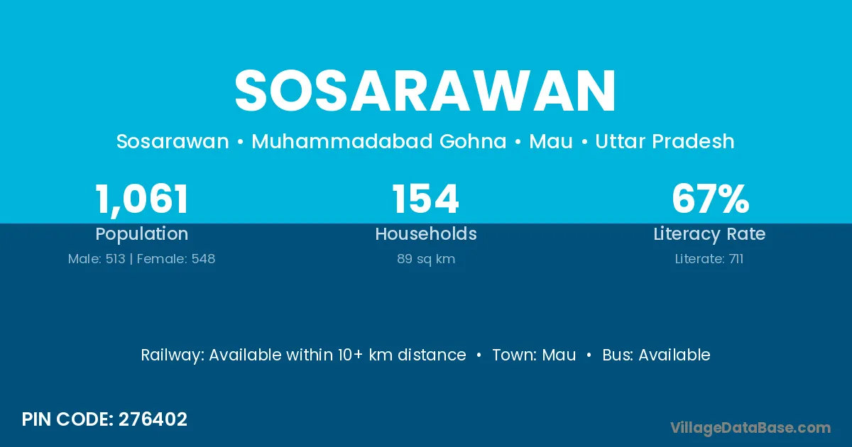 The literacy rate of Sosarawan village is 67.01%. Male literacy stands at 76.22% and female literacy at 58.39%.
