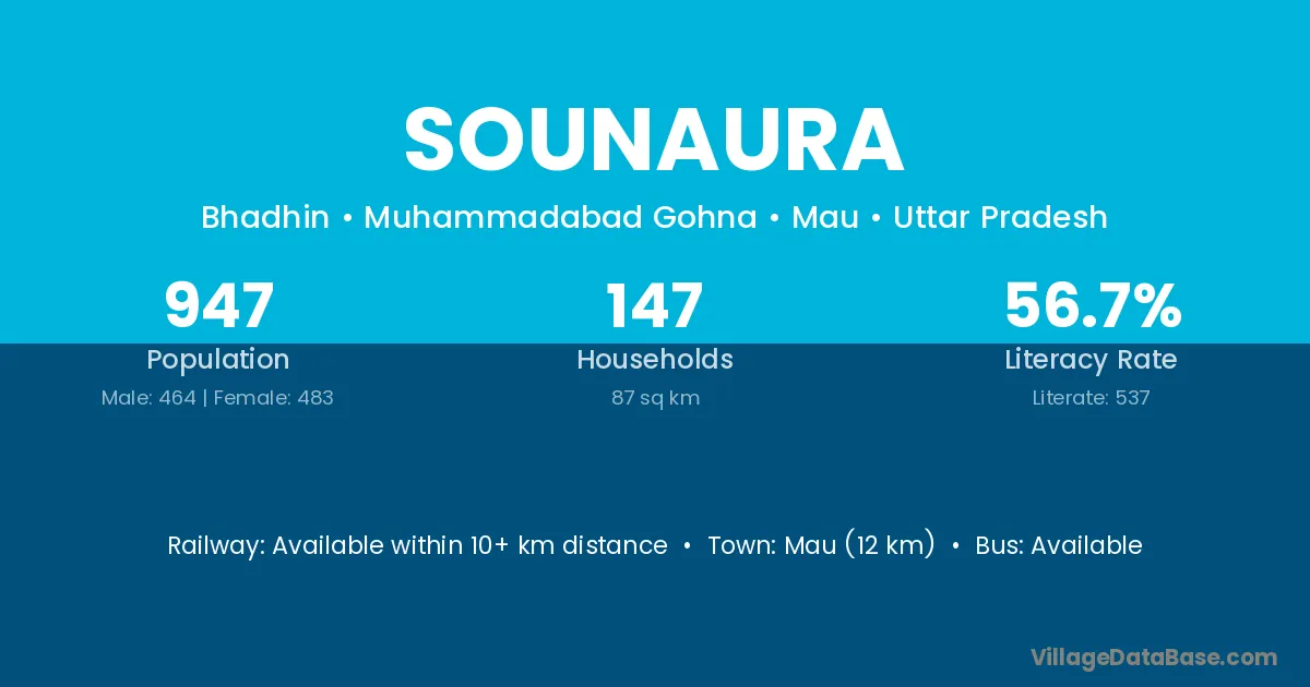 Mau (12 km) is the nearest town to Sounaura village for major economic activities and is located approximately 12 km away.