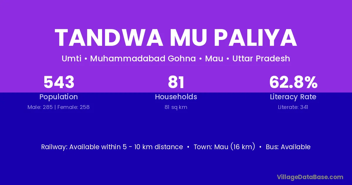 Mau (16 km) is the nearest town to Tandwa Mu Paliya village for major economic activities and is located approximately 16 km away.