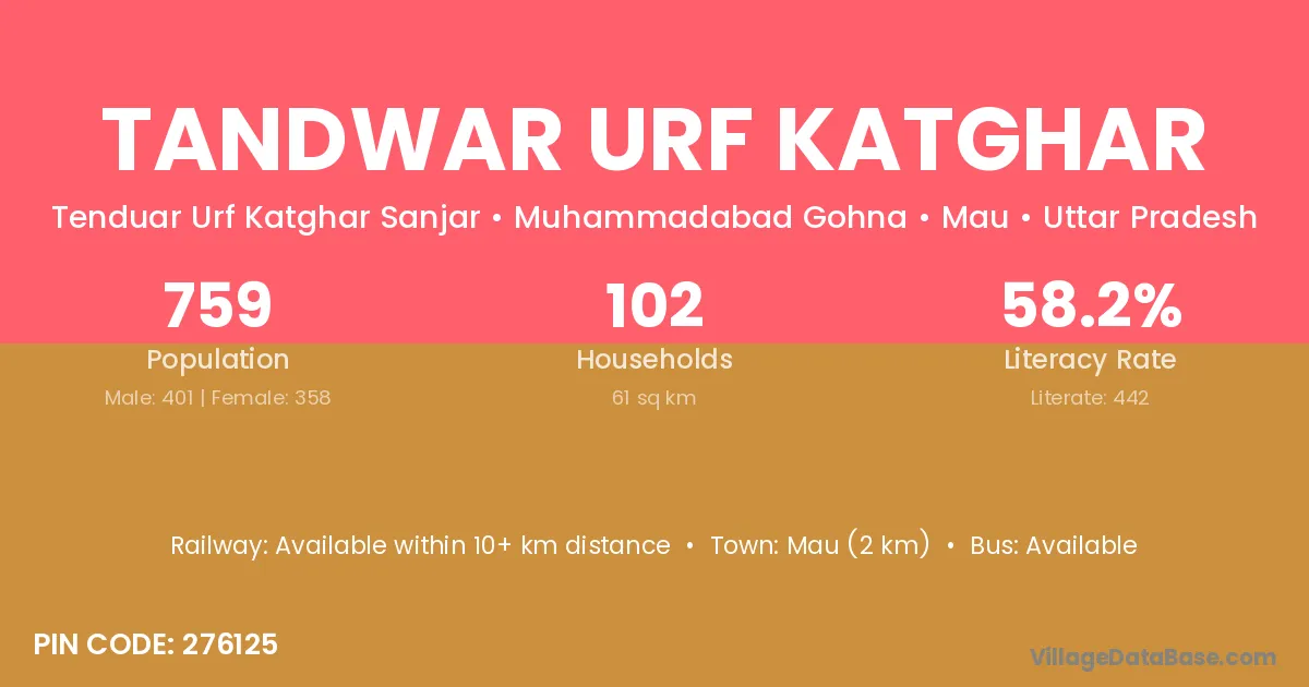 Mau (2 km) is the nearest town to Tandwar Urf Katghar village for major economic activities and is located approximately 2 km away.