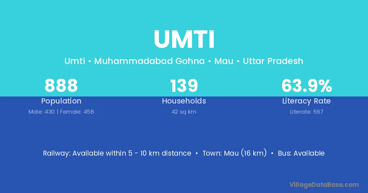 Mau (16 km) is the nearest town to Umti village for major economic activities and is located approximately 16 km away.