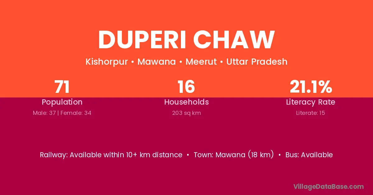 Mawana (18 km) is the nearest town to Duperi Chaw village for major economic activities and is located approximately 18 km away.