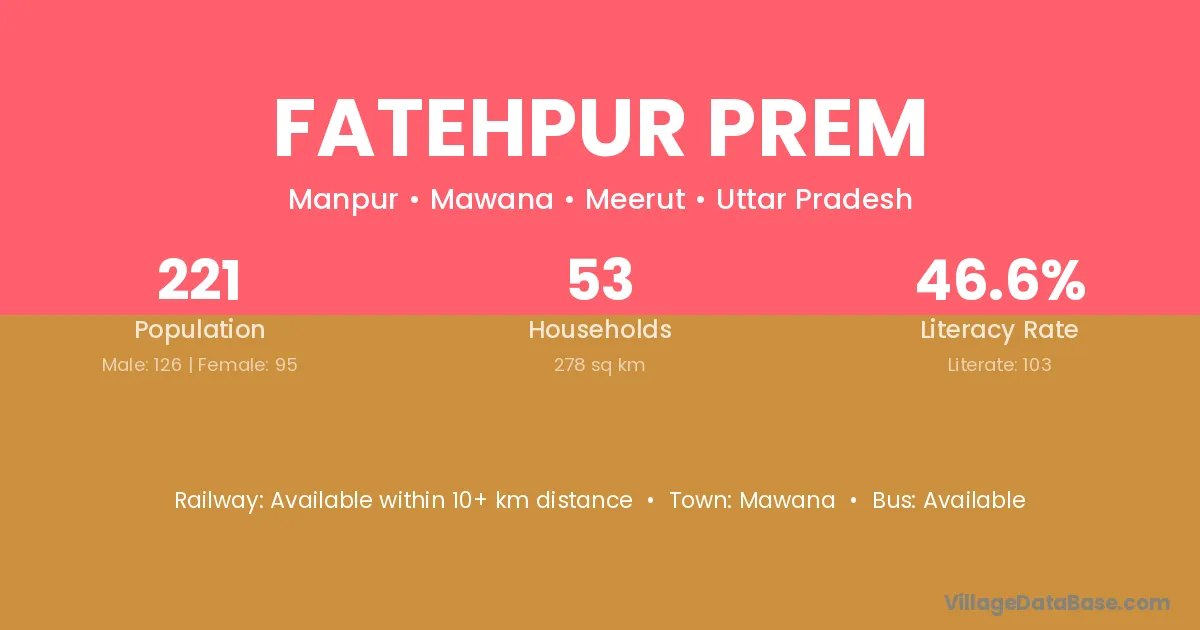 Fatehpur Prem village has a total population of 221 people, of which 126 are males and 95 are females.