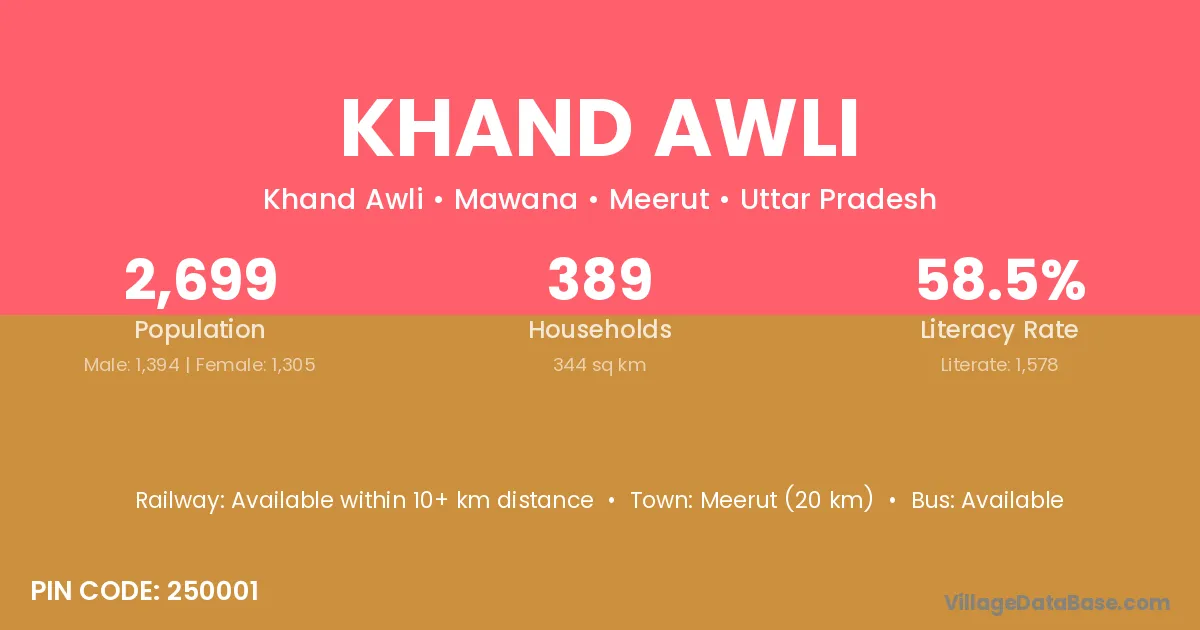 Meerut (20 km) is the nearest town to Khand Awli village for major economic activities and is located approximately 20 km away.