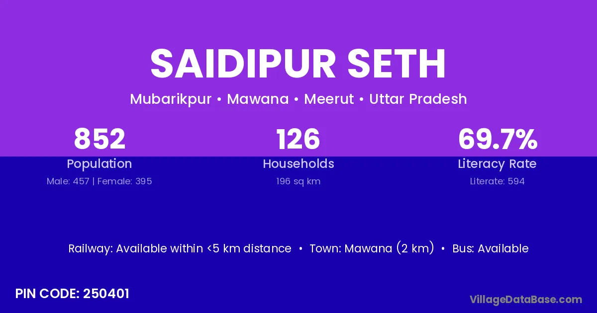 Mawana (2 km) is the nearest town to Saidipur Seth village for major economic activities and is located approximately 2 km away.