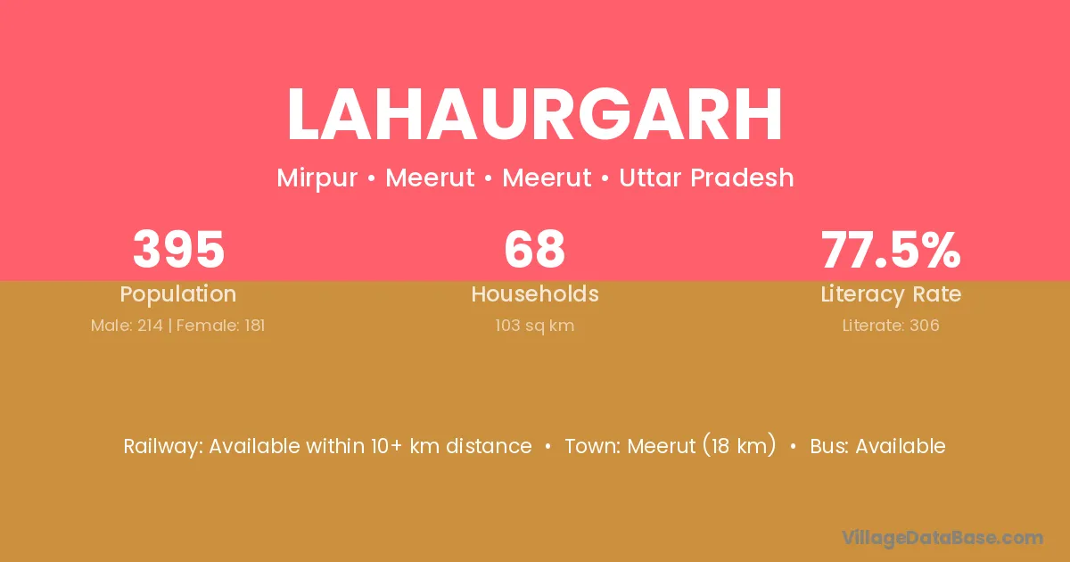 Meerut (18 km) is the nearest town to Lahaurgarh village for major economic activities and is located approximately 18 km away.