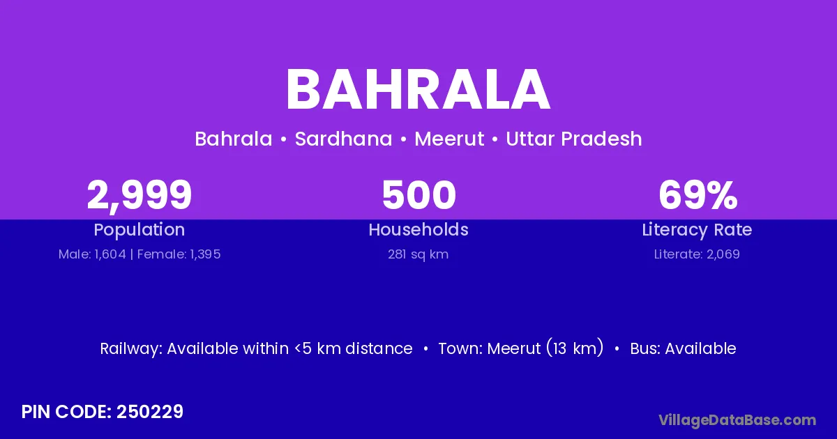 Meerut (13 km) is the nearest town to Bahrala village for major economic activities and is located approximately 13 km away.