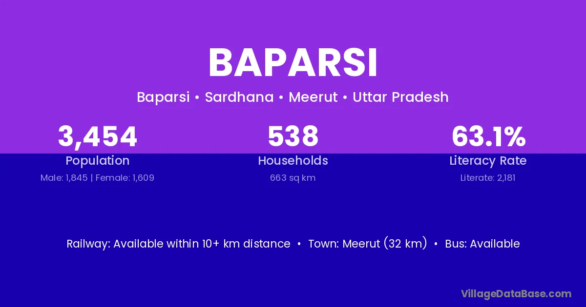 Meerut (32 km) is the nearest town to Baparsi village for major economic activities and is located approximately 32 km away.