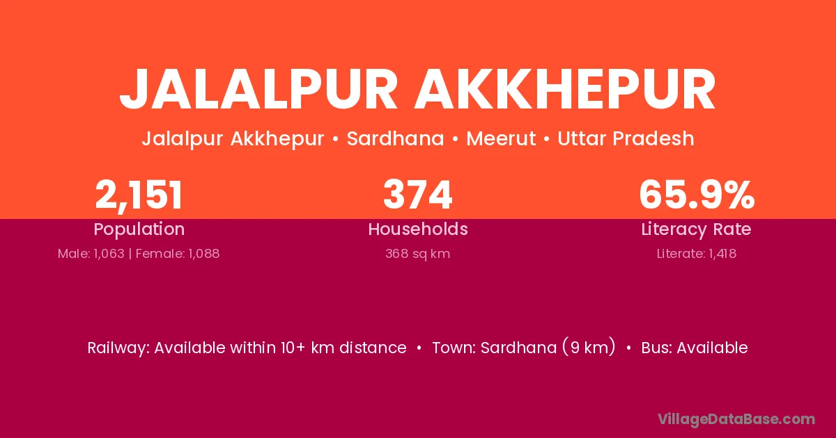 Sardhana (9 km) is the nearest town to Jalalpur Akkhepur village for major economic activities and is located approximately 9 km away.