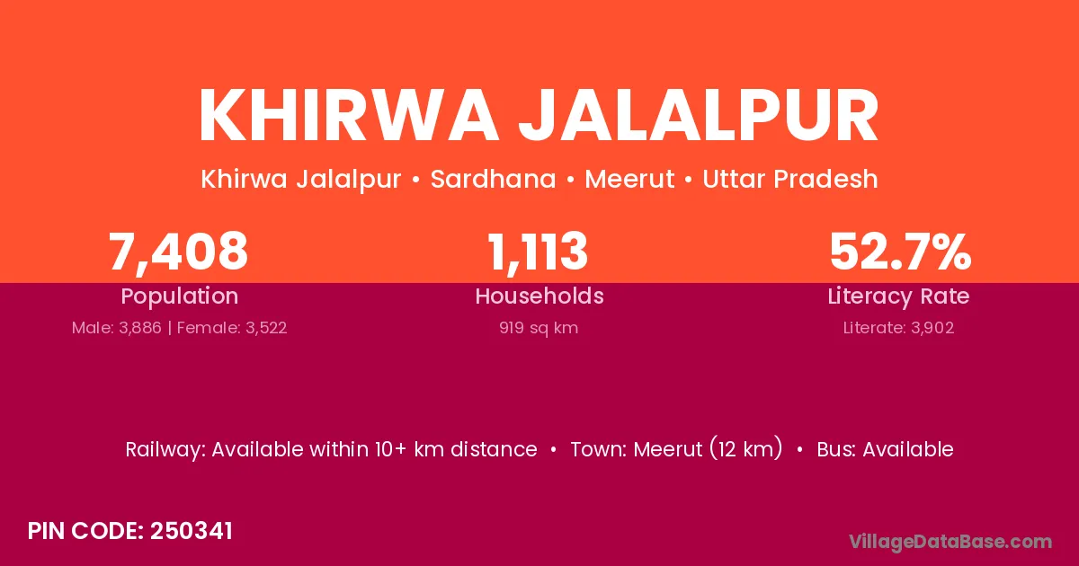Khirwa Jalalpur village has a total population of 7,408 people, of which 3,886 are males and 3,522 are females.