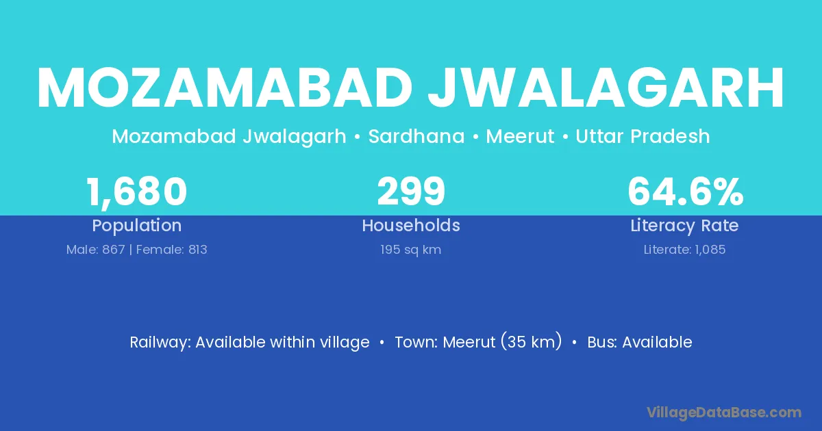 Meerut (35 km) is the nearest town to Mozamabad Jwalagarh village for major economic activities and is located approximately 35 km away.