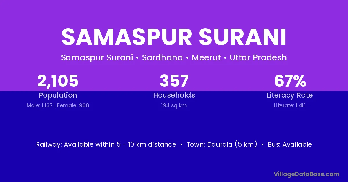 Daurala (5 km) is the nearest town to Samaspur Surani village for major economic activities and is located approximately 5 km away.