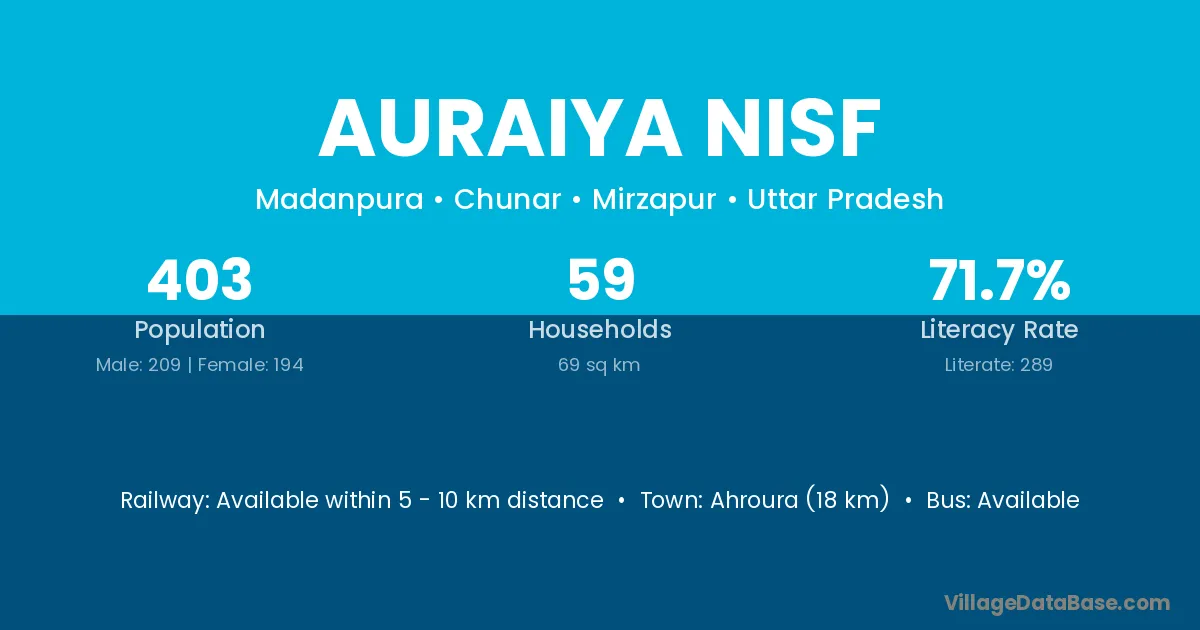 Auraiya Nisf village has a total population of 403 people, of which 209 are males and 194 are females.