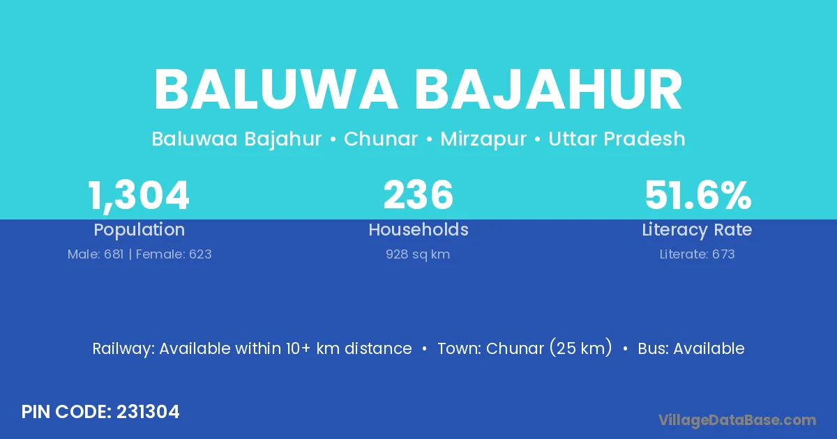 Chunar (25 km) is the nearest town to Baluwa Bajahur village for major economic activities and is located approximately 25 km away.