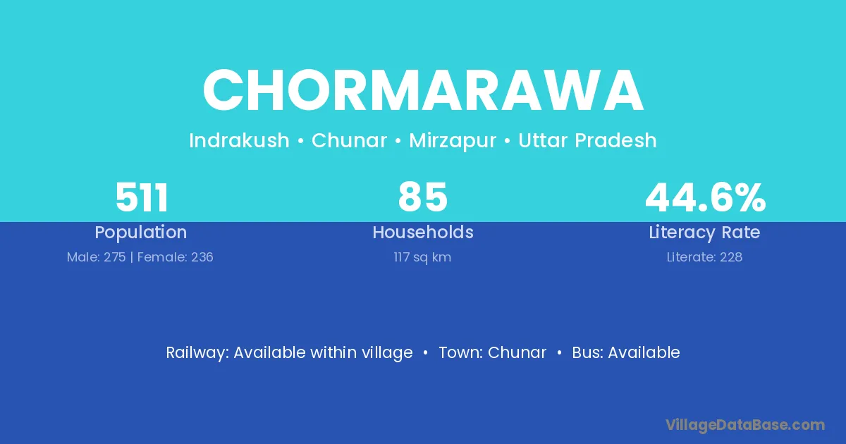 Chormarawa village has a total population of 511 people, of which 275 are males and 236 are females.