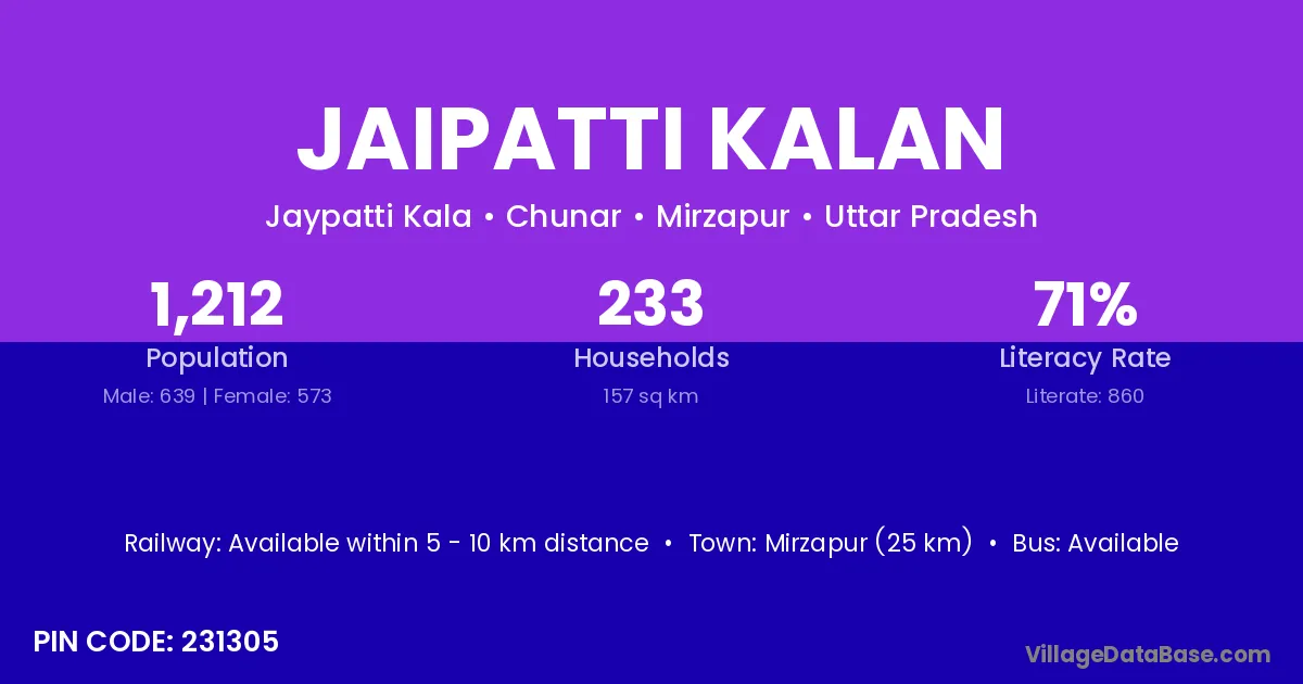Mirzapur (25 km) is the nearest town to Jaipatti Kalan village for major economic activities and is located approximately 25 km away.