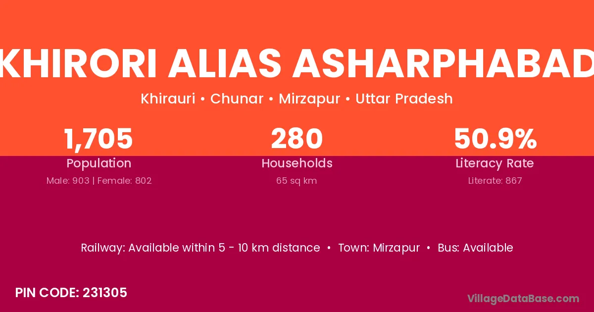 Khirori Alias Asharphabad village has a total population of 1,705 people, of which 903 are males and 802 are females.