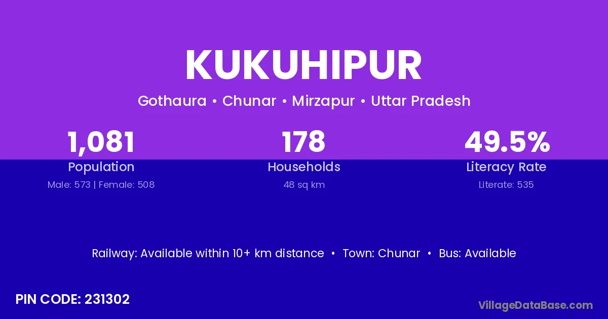 Kukuhipur village has a total population of 1,081 people, of which 573 are males and 508 are females.