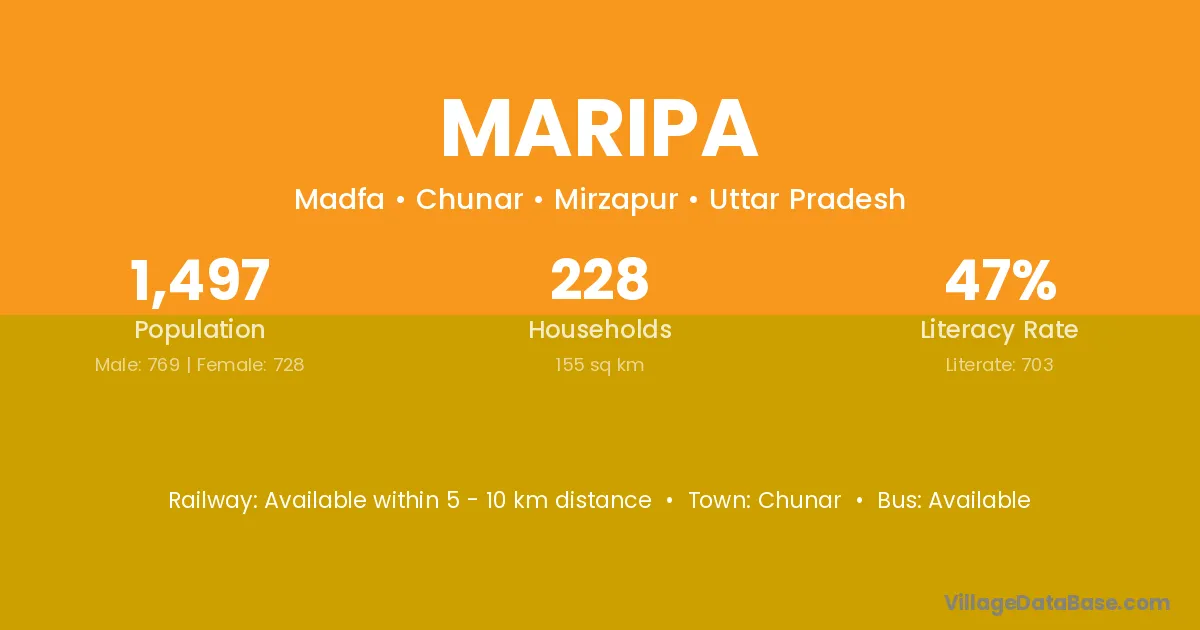 Maripa village has a total population of 1,497 people, of which 769 are males and 728 are females.