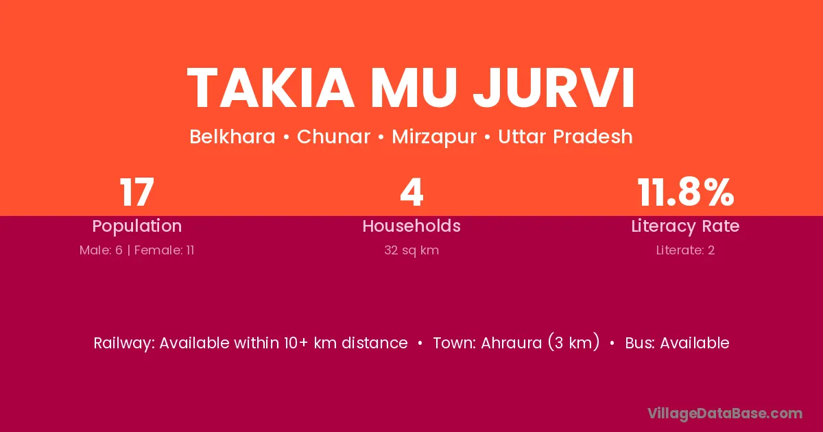 Ahraura (3 km) is the nearest town to Takia Mu Jurvi village for major economic activities and is located approximately 3 km away.