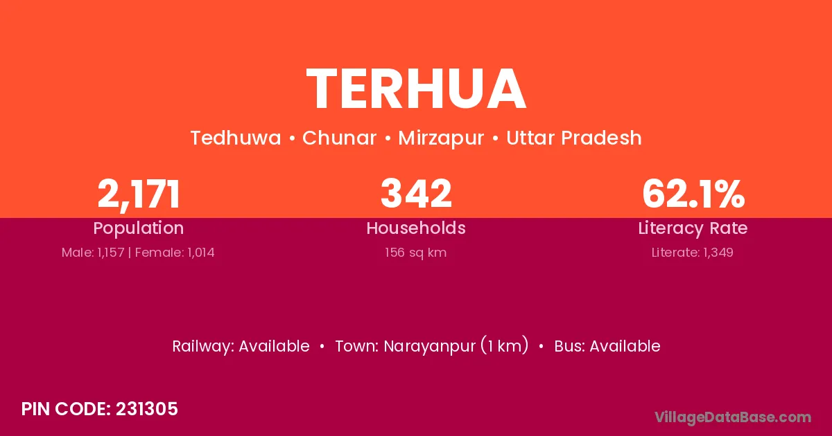 Narayanpur (1 km) is the nearest town to Terhua village for major economic activities and is located approximately 1 km away.