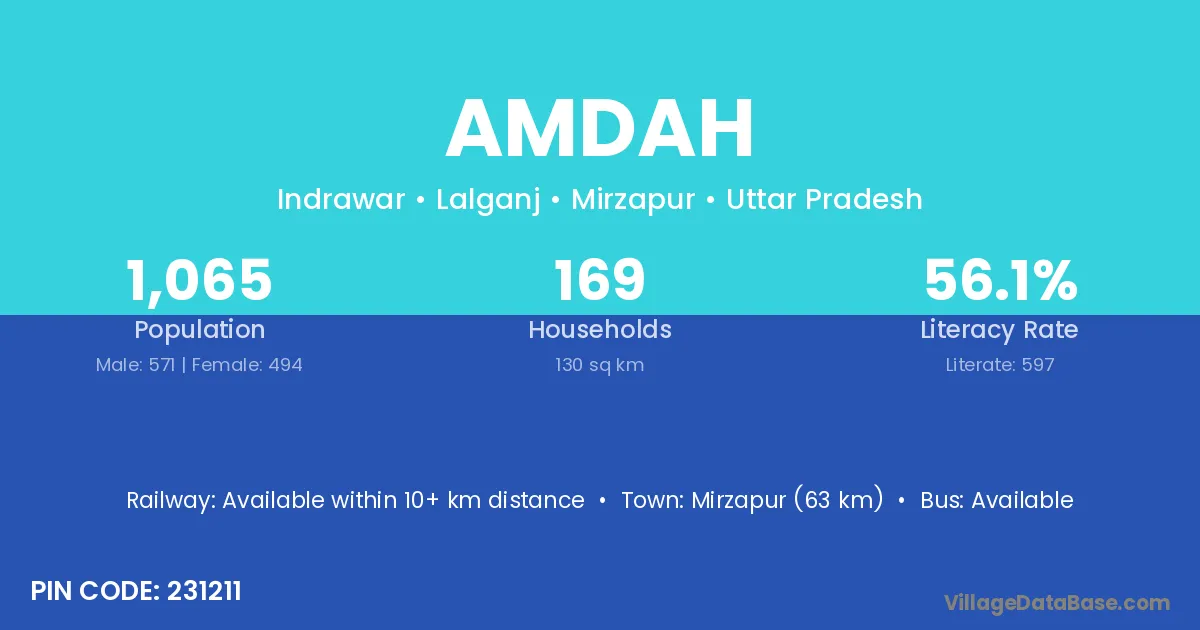 Mirzapur (63 km) is the nearest town to Amdah village for major economic activities and is located approximately 63 km away.