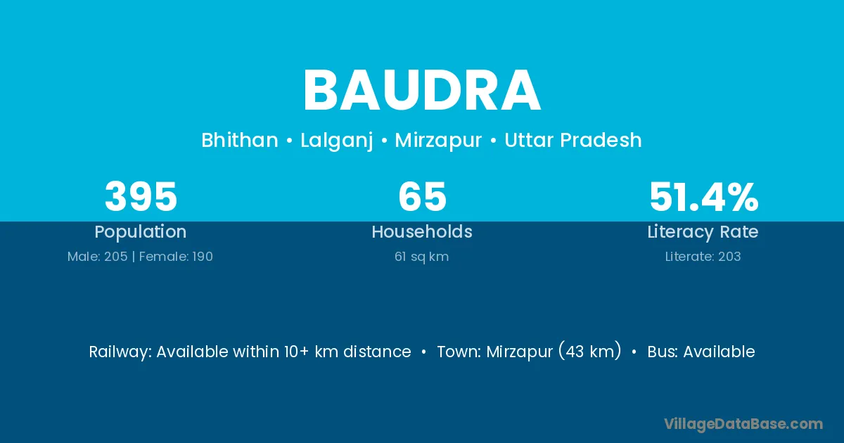 Mirzapur (43 km) is the nearest town to Baudra village for major economic activities and is located approximately 43 km away.