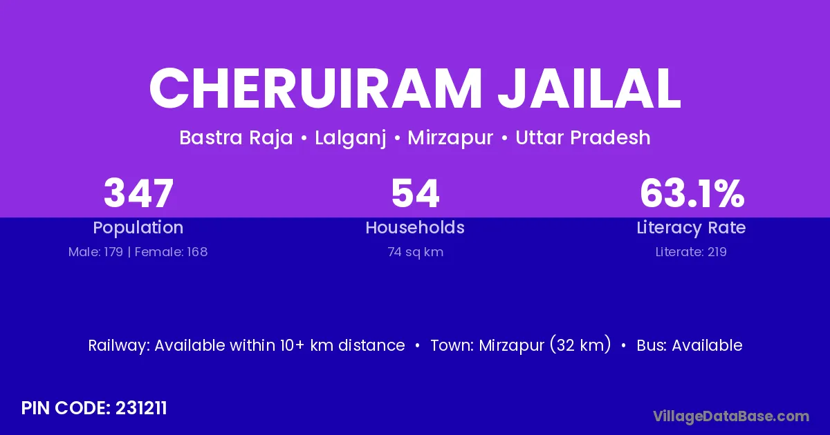 Mirzapur (32 km) is the nearest town to Cheruiram Jailal village for major economic activities and is located approximately 32 km away.