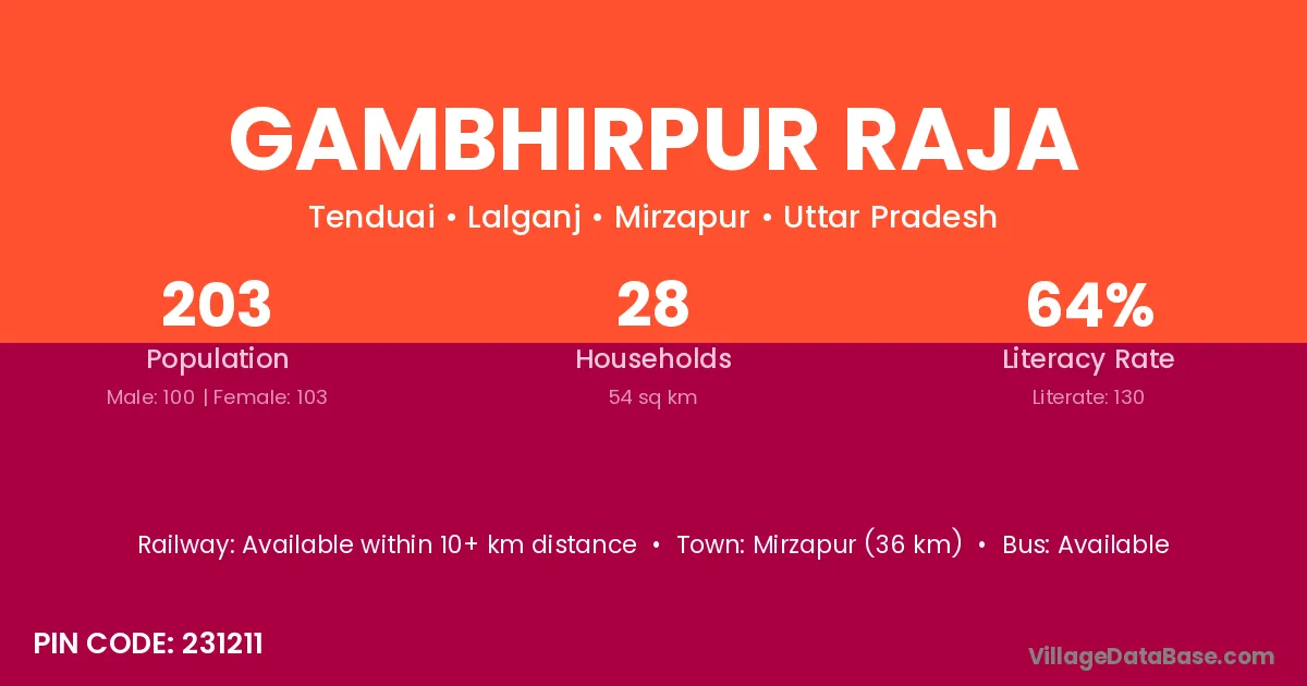 Mirzapur (36 km) is the nearest town to Gambhirpur Raja village for major economic activities and is located approximately 36 km away.