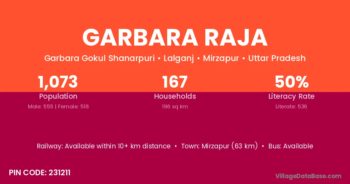 Mirzapur (63 km) is the nearest town to Garbara Raja village for major economic activities and is located approximately 63 km away.