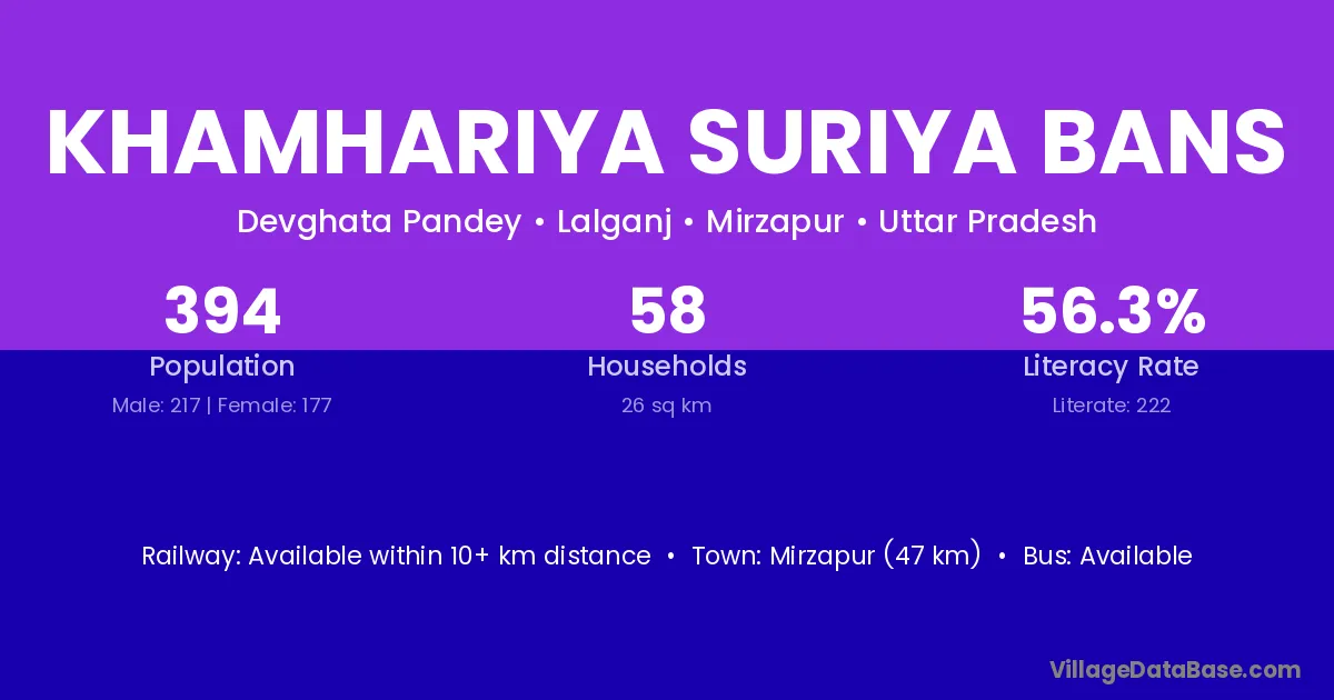 Khamhariya Suriya Bans village has a total population of 394 people, of which 217 are males and 177 are females.