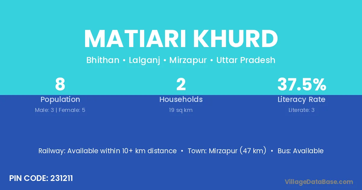 Matiari Khurd village has a total population of 8 people, of which 3 are males and 5 are females.