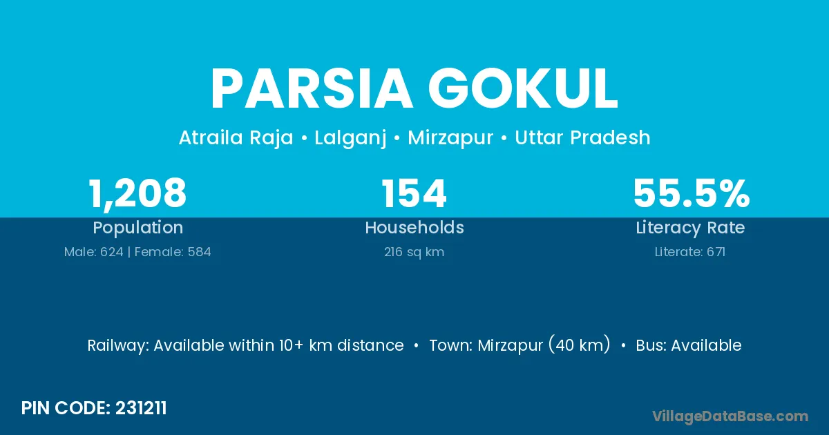 Mirzapur (40 km) is the nearest town to Parsia Gokul village for major economic activities and is located approximately 40 km away.