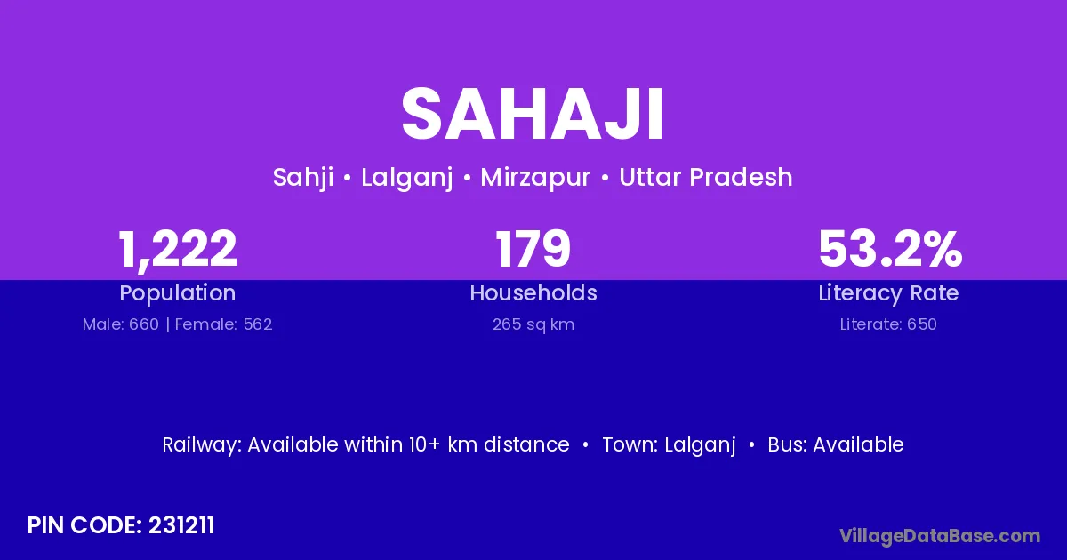 Sahaji village has a total population of 1,222 people, of which 660 are males and 562 are females.