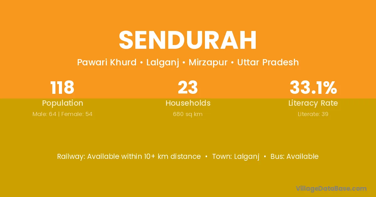 The literacy rate of Sendurah village is 33.05%. Male literacy stands at 39.06% and female literacy at 25.93%.