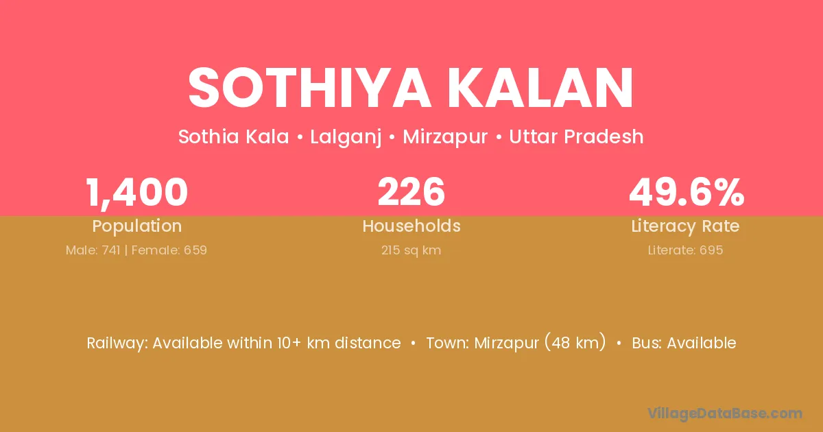 Sothiya Kalan village has a total population of 1,400 people, of which 741 are males and 659 are females.