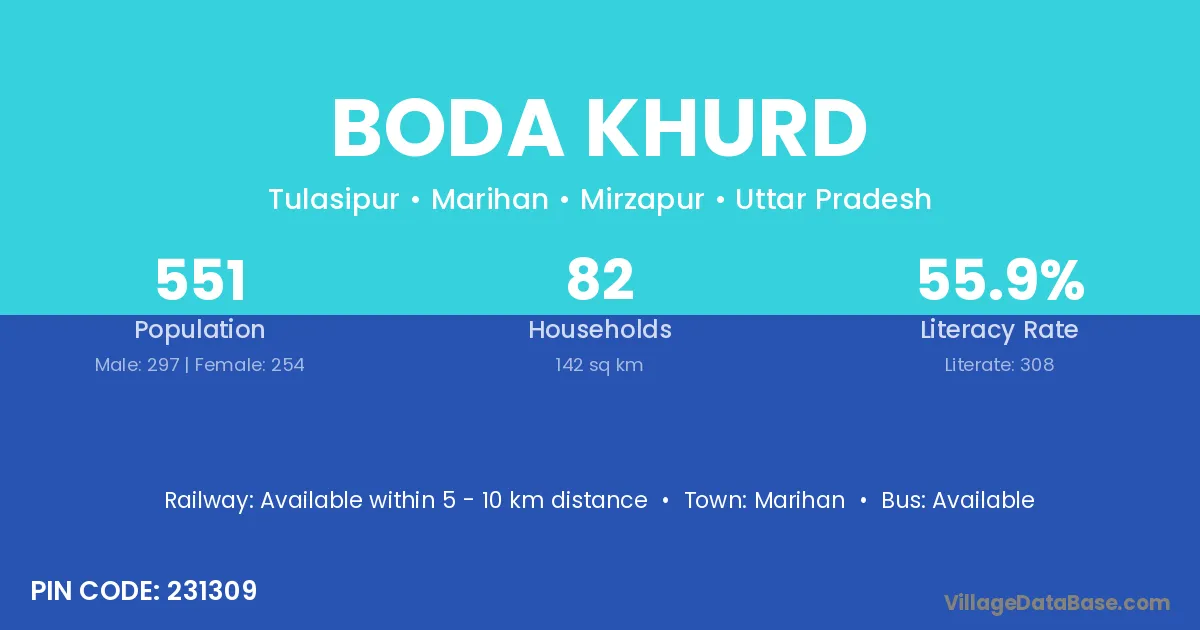 Boda Khurd village has a total population of 551 people, of which 297 are males and 254 are females.