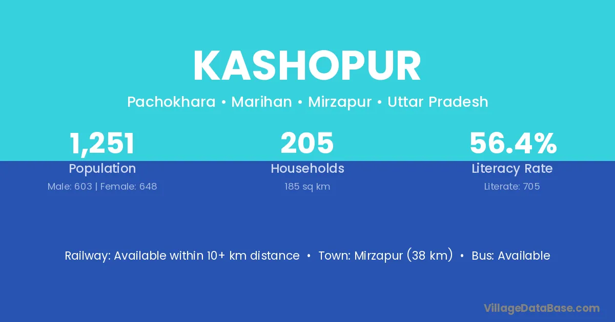 Mirzapur (38 km) is the nearest town to Kashopur village for major economic activities and is located approximately 38 km away.
