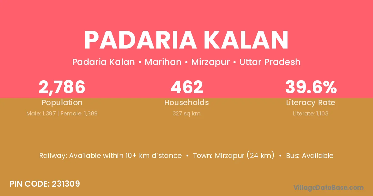 Mirzapur (24 km) is the nearest town to Padaria Kalan village for major economic activities and is located approximately 24 km away.