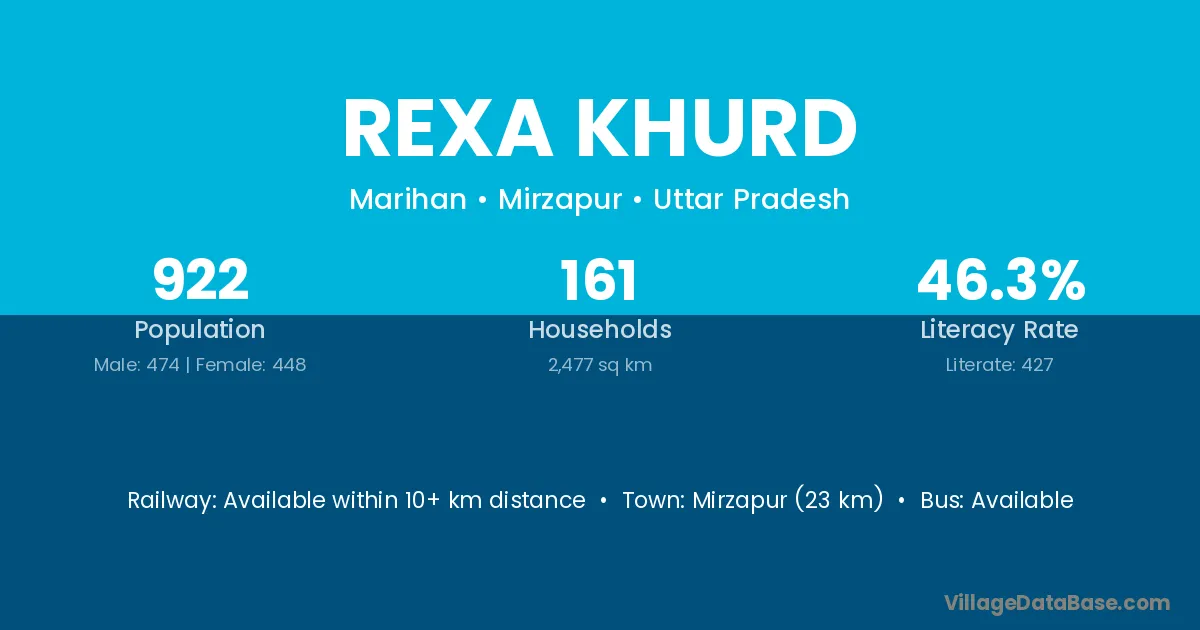 Mirzapur (23 km) is the nearest town to Rexa Khurd village for major economic activities and is located approximately 23 km away.