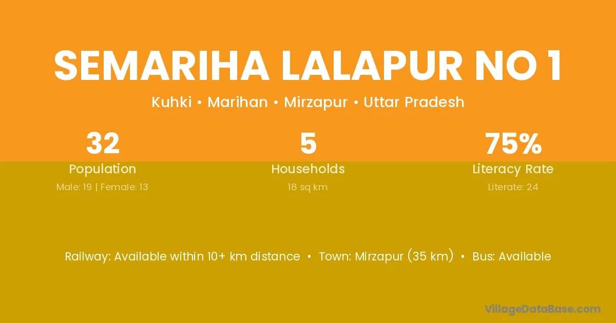 Mirzapur (35 km) is the nearest town to Semariha Lalapur No 1 village for major economic activities and is located approximately 35 km away.