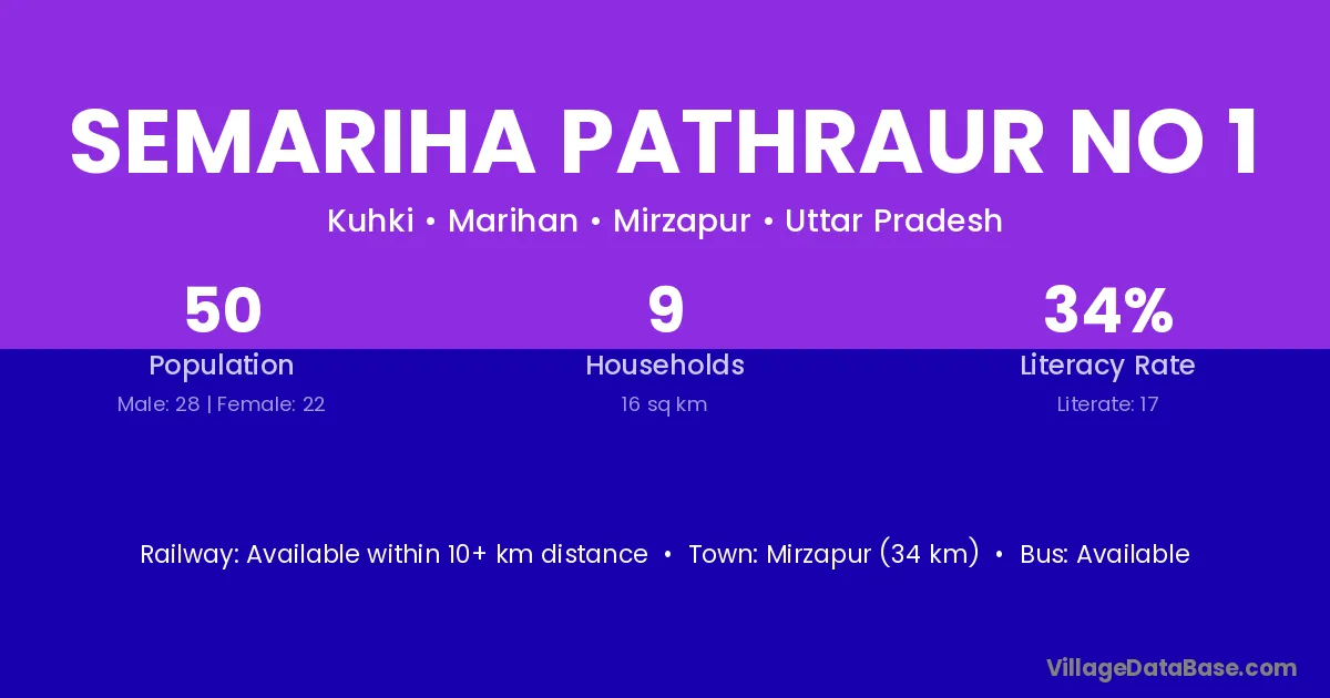 Mirzapur (34 km) is the nearest town to Semariha Pathraur No 1 village for major economic activities and is located approximately 34 km away.