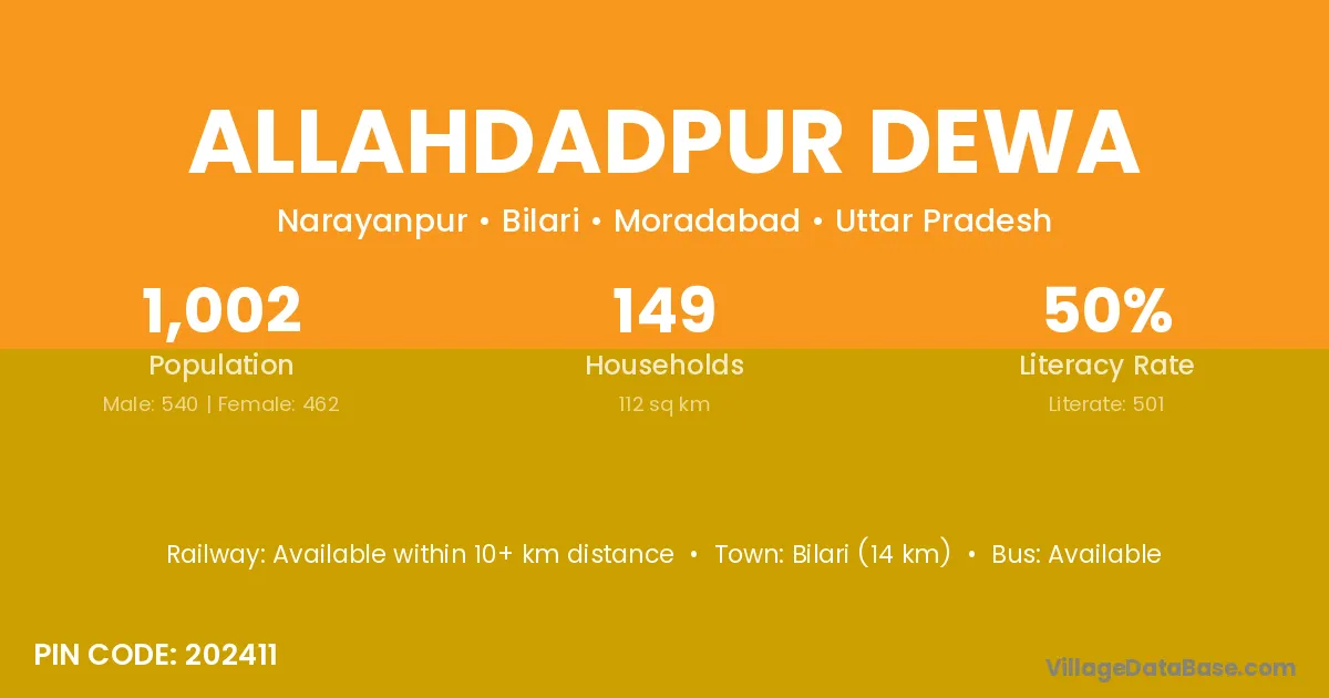 Bilari (14 km) is the nearest town to Allahdadpur Dewa village for major economic activities and is located approximately 14 km away.
