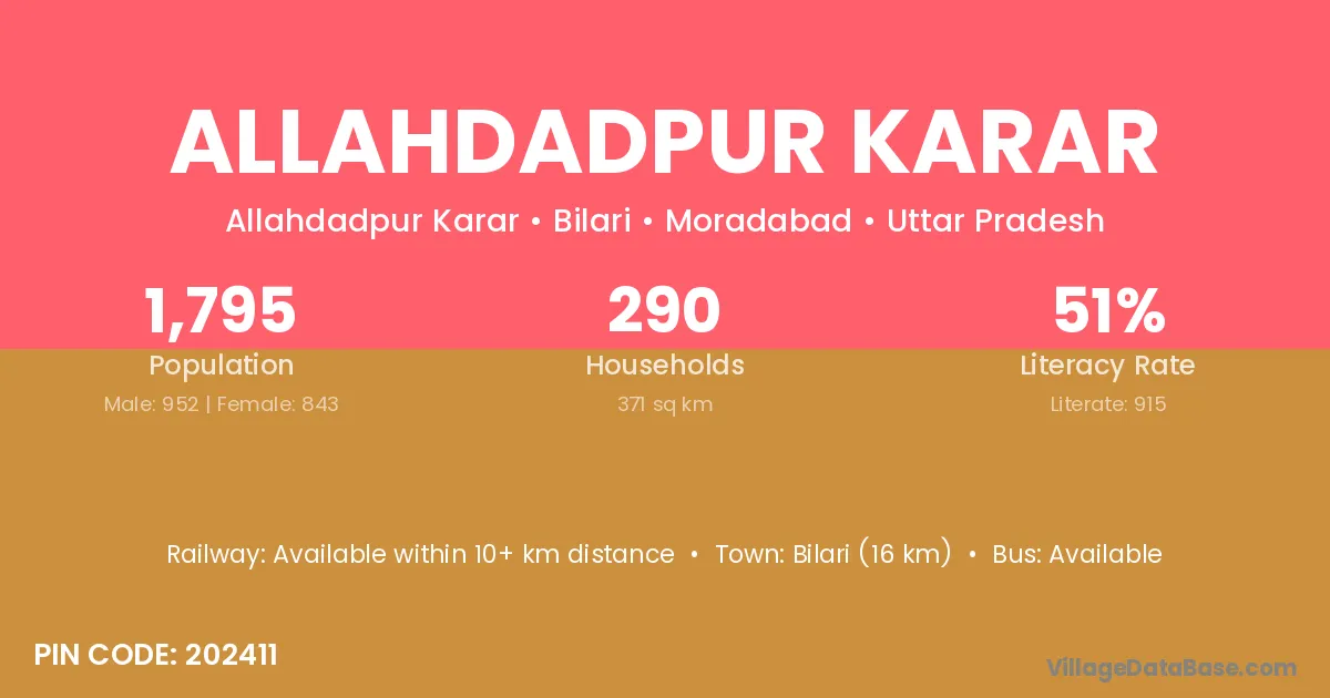 Bilari (16 km) is the nearest town to Allahdadpur Karar village for major economic activities and is located approximately 16 km away.