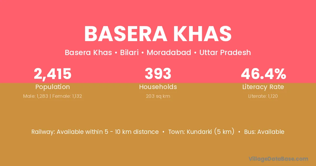 Kundarki (5 km) is the nearest town to Basera Khas village for major economic activities and is located approximately 5 km away.