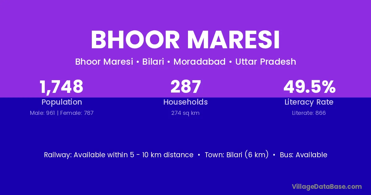 Bilari (6 km) is the nearest town to Bhoor Maresi village for major economic activities and is located approximately 6 km away.