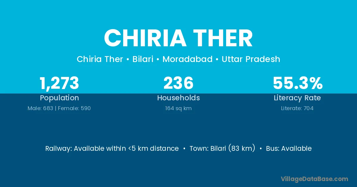 Bilari (83 km) is the nearest town to Chiria Ther village for major economic activities and is located approximately 83 km away.