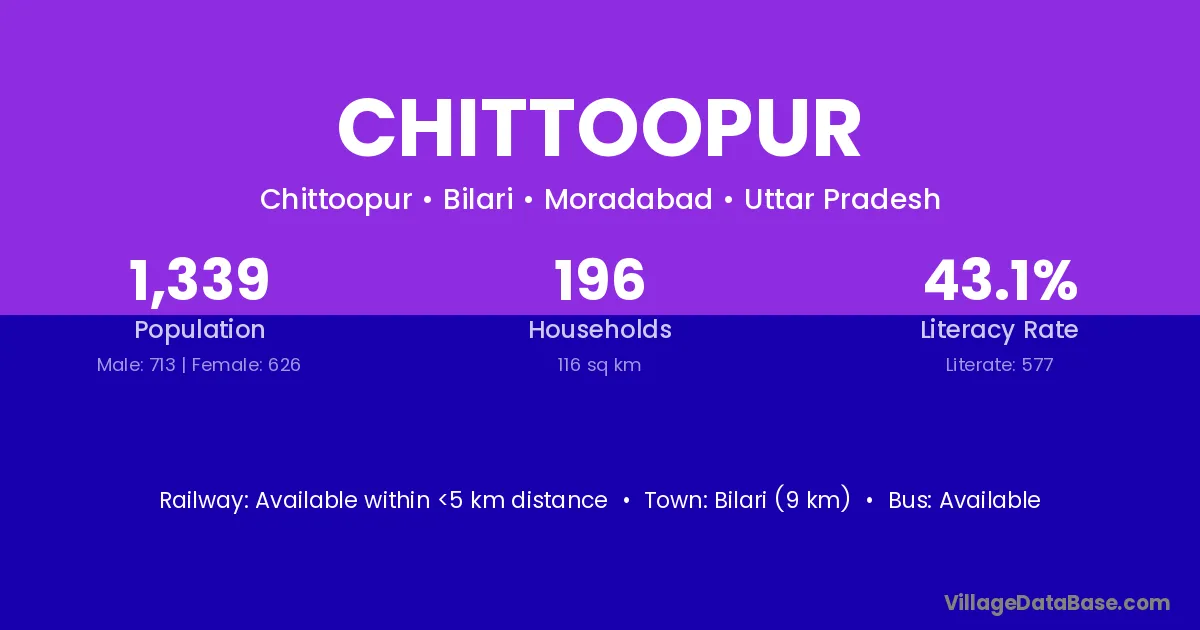 Chittoopur village has a total population of 1,339 people, of which 713 are males and 626 are females.