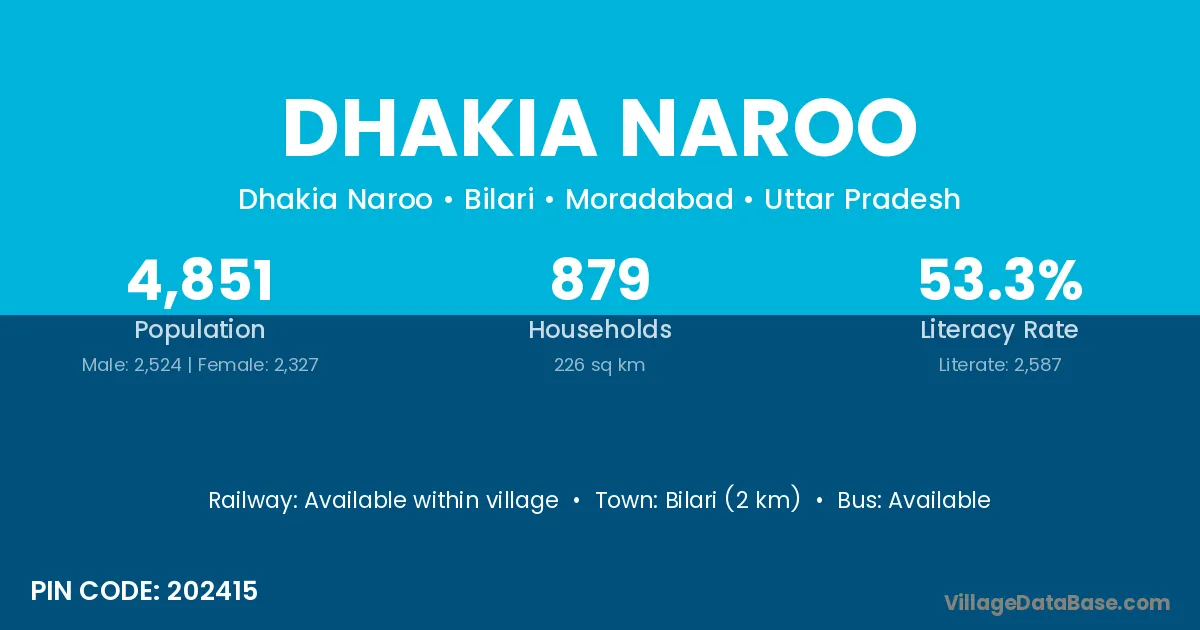 Dhakia Naroo village has a total population of 4,851 people, of which 2,524 are males and 2,327 are females.